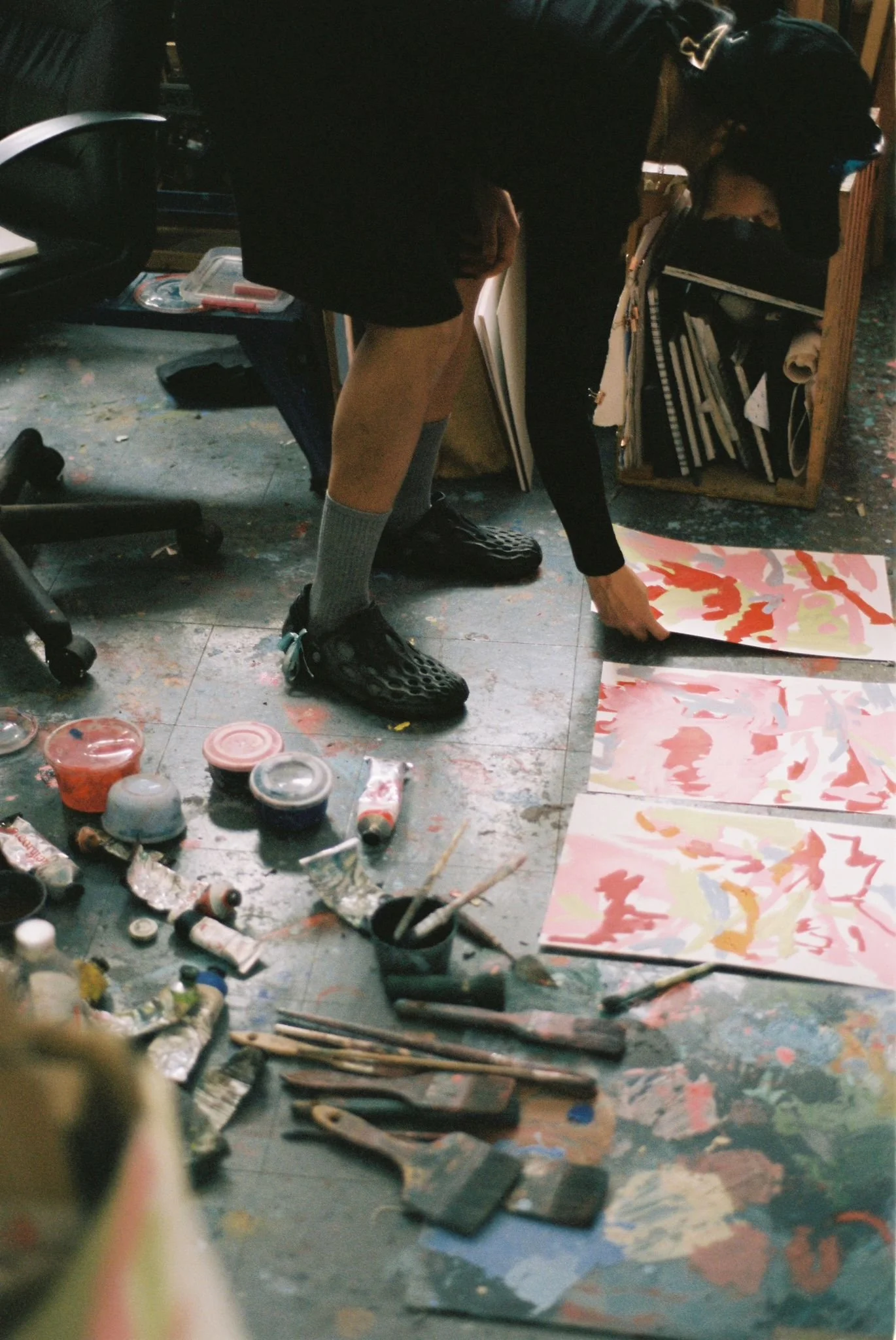 Through movement, each composition explores a visual perspective of these aspects. Within these intimate moments she is being playful, open to failure, alluding to a place of feeling loss and love. Humorous qualities are portrayed in gestural mark making and shapes. These factors are important, as the purpose is to conflict between opposing themes, from colour and form to contextual ideologies. The use of colour develops her sense and appreciation of space, switching background and foreground to conflict the tone. The use of opposites makes it uncomfortable, uneasy to the eye. Yet, the use of viscous vertical directions restores stability and animation. This lingering intrudes in many areas, instilling chaos and a sense of overbearing. However, there remains a sense of stillness in these paintings that aim to grasp those fragile moments of joy and contentment.